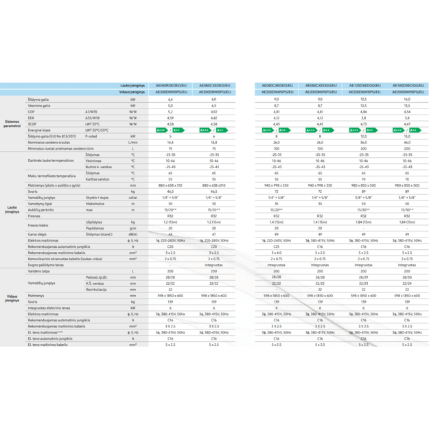 Vidinio bloko modelis: AE200DNWSPG/EU Išorinio bloko modelis: AE125DXEDGG/EU Nominali šildymo galia: 12.5 kW Nominali vėsinimo galia: 12.5 kW COP: 4.86 EER: 3.8 SCOP: 4.73 Energinė klasė: A+++ / A++ Šildymo galia PRATED: 12 kW Šildymo darbinė temperatūra: –25 ~ 35 °C Vėsinimo darbinė temperatūra: 10 ~ 46 °C Karšto vandens darbinė temperatūra: –25 ~ 43 °C Maks. termofikato temperatūra (šildymas): 65 °C Maks. termofikato temperatūra (karštas vanduo): 70 °C Talpa: 200 l Integruotas elektrinis tenas: 6 kW Dugno pašildymo tenas: integruotas Maks. vamzdyno ilgis tarp blokų: 50 m Šaltnešio tipas: R32 Freono kiekis: 1.84 kg (15 m) Lauko įrenginio garso slėgis: 49 dB(A) Vidaus bloko matmenys (P × A × G): 598 × 1850 × 600 mm Lauko bloko matmenys (P × A × G): 980 × 850 × 500 mm Vidaus bloko svoris: 139 kg Lauko bloko svoris: 89 kg Elektros maitinimas: 3 / 400 V / 50 Hz